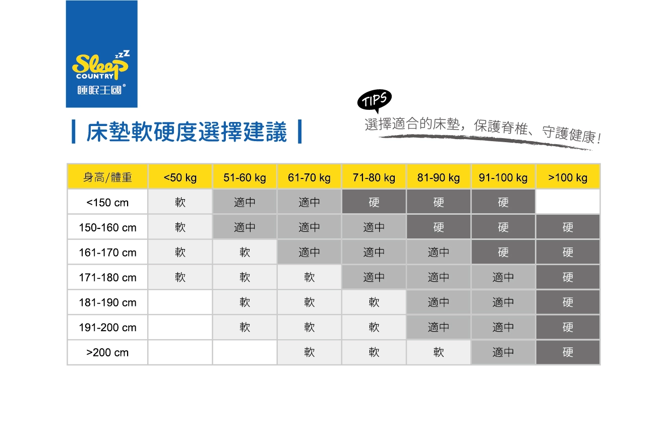 提供身高/體重的建議表,可參考選擇需要的軟硬度: