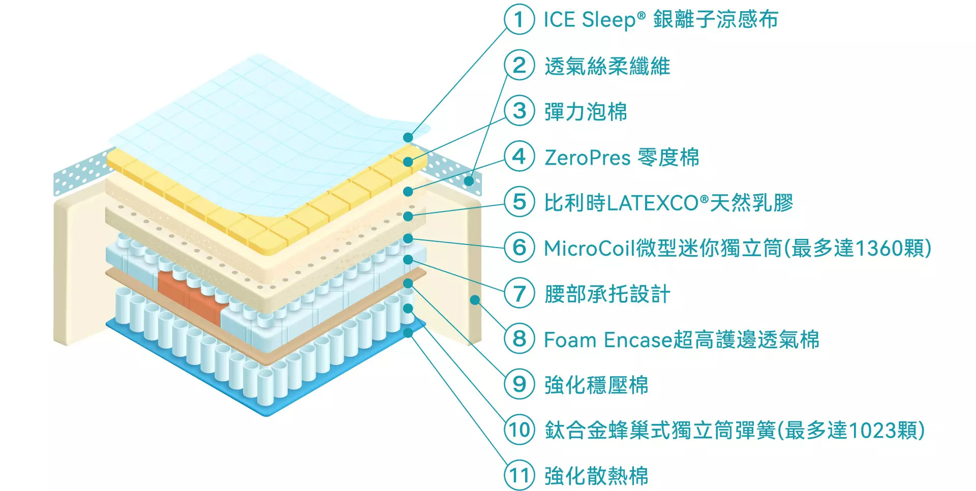 | 主要襯材 | ZeroPres 零度棉、MicroCoil微型迷你獨立筒(最多達1360顆)、腰部承托設計、比利時Latexco®︎天然乳膠、Foam Encase超高護邊透氣棉、透氣絲柔纖維、彈力泡棉、強化穩壓棉 |