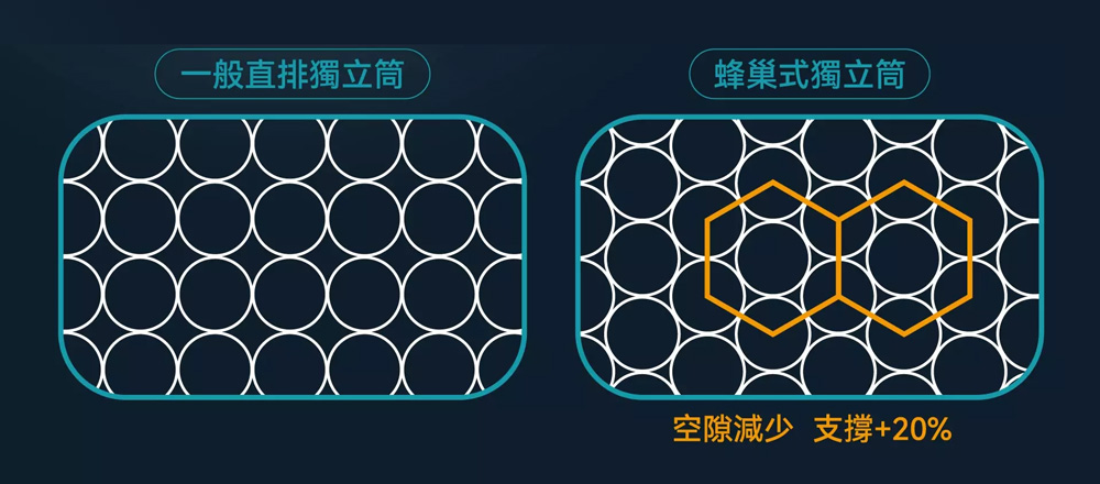 高達 1,023 顆獨立筒以蜂巢式排列,承托密度提升 20%,精準貼合身體曲線。