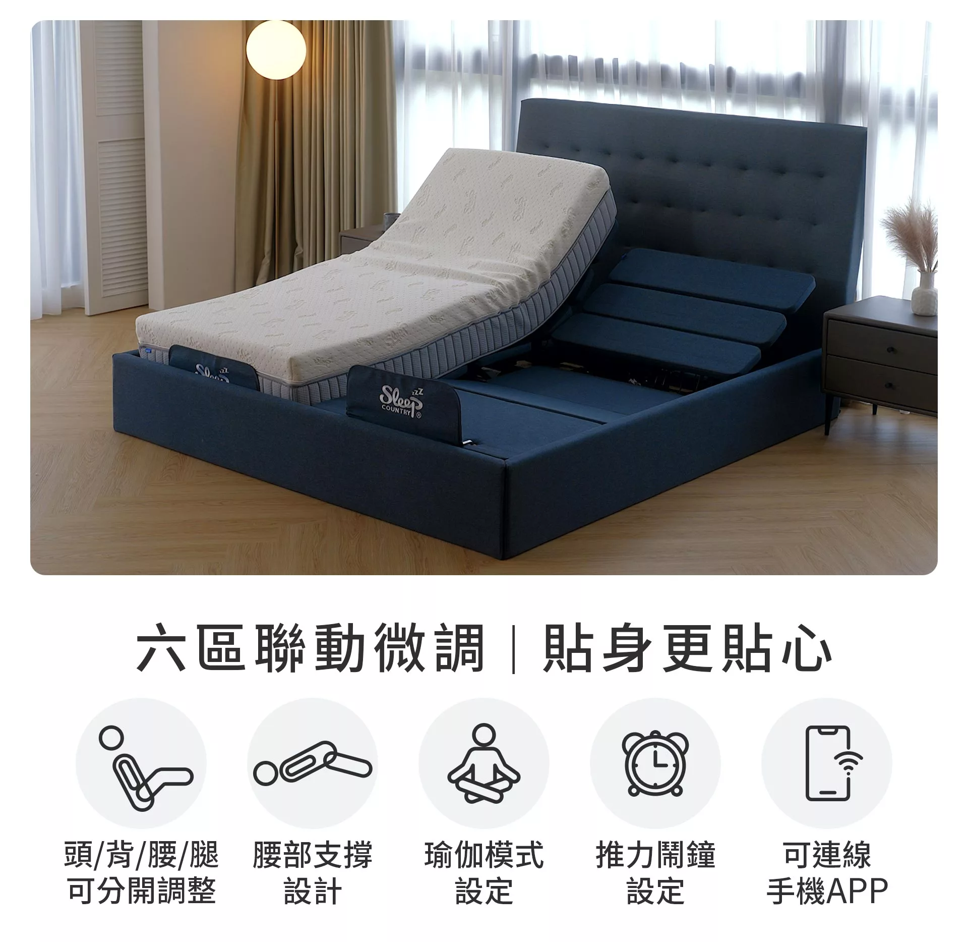 單床配有4顆德國Okin馬達,搖控器與APP可同時一鍵操作